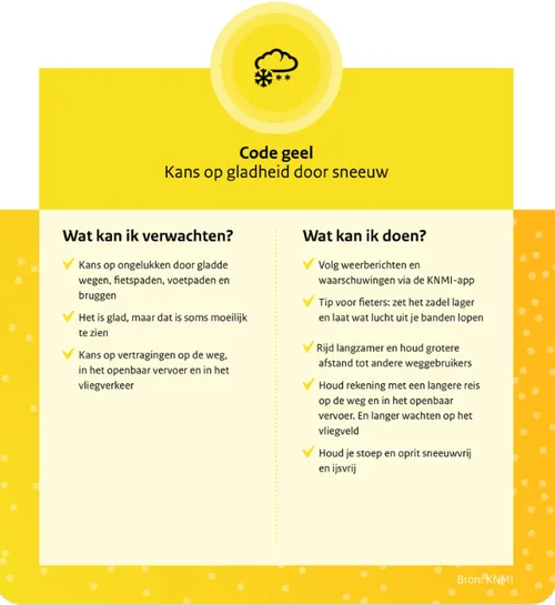In de loop van de avond gaat het vanaf het zuidwesten dooien, maar in het noordoosten kan het volgens het KNMI nog tot in de nacht naar maandag glad blijven. De code geel geldt vanaf 14:00 uur eerst in Zeeland, Zuid-Holland en Noord-Brabant. Daar kan de waarschuwing waarschijnlijk in de loop van de avond worden beëindigd. In Groningen, Drenthe, Overijssel en op de Waddeneilanden geldt de waarschuwing voor sneeuw en gladheid vanaf 18:00 uur en houdt die naar verwachting stand tot 04:00.
