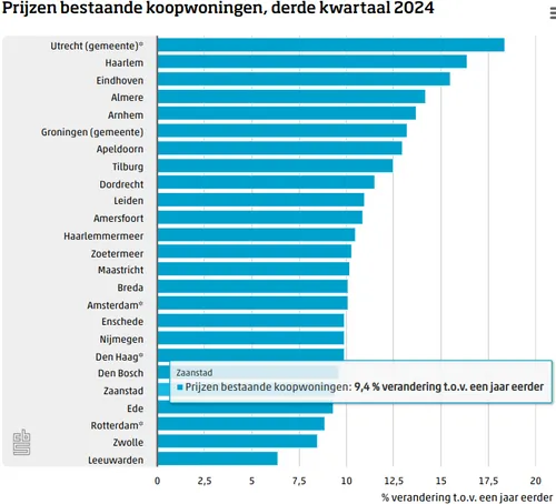De prijs van bestaande koopwoningen is in Zaanstad tot en met het derde kwartaal van dit jaar minder gestegen dan in de meeste van de 25 grootste gemeenten. Buiten de vier grootste gemeenten was de stijging in Haarlem het grootst ten opzichte van een jaar eerder, in Leeuwarden het kleinst. stijging.