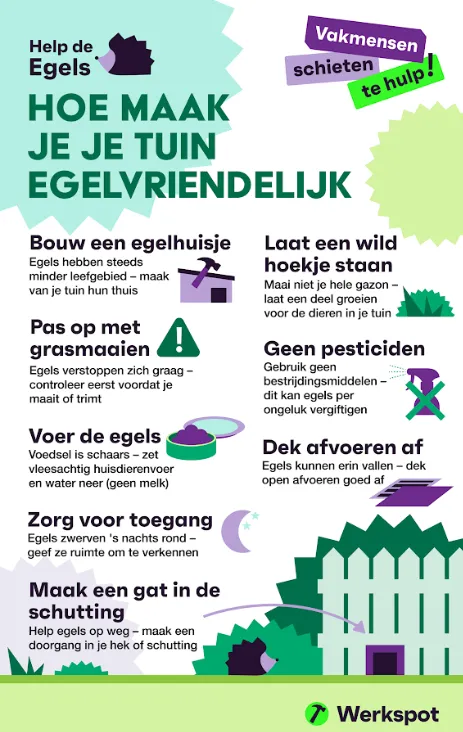 Iedereen met een buitenruimte kan wel iets doen om egels te helpen. Om tuinliefhebbers op weg te helpen hebben experts van Werkspot.nl een praktische lijst samengesteld met eenvoudige stappen om de tuin aantrekkelijk en veilig te maken voor egels, zodat deze geliefde nachtdiertjes een betere kans hebben om te overleven.