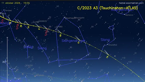 Zoals eerder gemeld is in de tweede helft van oktober de komeet C/2023 A3 (Tsuchinshan-Atlas) aan onze sterrenhemel te zien. De komeet staat momenteel in het sterrenbeeld Maagd, en beweegt via de Slang naar de Slangendrager. De 'staartster' was volgens Marc van der Sluys van Hemel.waarnemen.com in onze streken aanvankelijk vooral in de avondschemering zichtbaar.