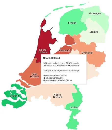 Heel anders is dat in Zeeland, waar minder dan vier op de tien inwoners zich storen aan hun buren. Ook Limburg en Friesland scoren relatief laag. Geluidsoverlast wordt in vrijwel elke provincie het vaakst genoemd als bron van irritatie. Inwoners van Drenthe geven met bijna 83 procent van de ondervraagden het vaakst aan blij te zijn met de relatie met hun buren. In Groningen daarentegen is dit slechts 61 procent, de laagste score van alle provincies. Daarbij moet worden aangetekend dat 'slechts' één op de tien Groningers zegt juist een slechte relatie te hebben met de buren. In Flevoland is dit maar liefst één op de zes.