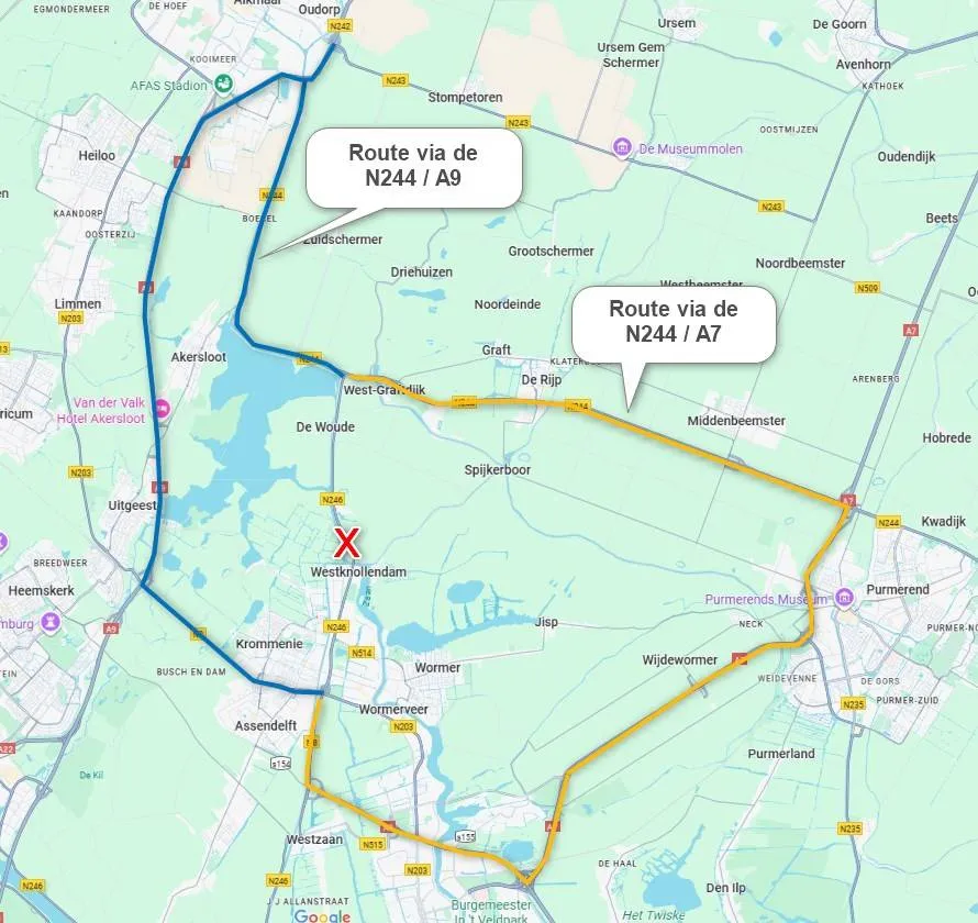 De N246 wordt afgesloten tussen de Noorddijk in West-Knollendam en de Markervaart in Markenbinnen. Nood- en hulpdiensten, bussen en (brom)fietsers kunnen er wel langs. Voor gemotoriseerd verkeer richting Zaanstad geldt een hoofdomleidingsroute via de N244 – A9 – N8 en andersom. Deze route wordt met borden aangegeven. Een alternatief is omrijden via de A7.