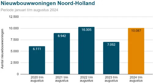 Dit jaar zijn er in onze provincie 338 woningen per 100.000 inwoners bijgekomen. Vorig jaar waren dat er in dezelfde periode nog 301. De toename komt vooral door het aantal nieuwbouwwoningen. Dit jaar zijn er 339 nieuwbouwwoningen per 100.000 inwoners bijgekomen, terwijl dat er vorig jaar nog 239 waren. Hiermee ligt de toename van de woningvoorraad in Noord-Holland 39 procent boven het Nederlandse gemiddelde van 243 woningen per 100.000 inwoners.