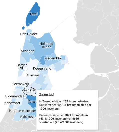 De (veelal elektrische) brommobiel wordt steeds populairder. In vijf jaar tijd groeide het aantal in Nederland met ruim 38 procent naar 23.666 stuks. Binnen Noord-Holland zijn het vooral Ouder-Amstel en Amsterdam waar de 45-kilometerauto in trek is. Volgens een analyse van mobiliteitsplatform