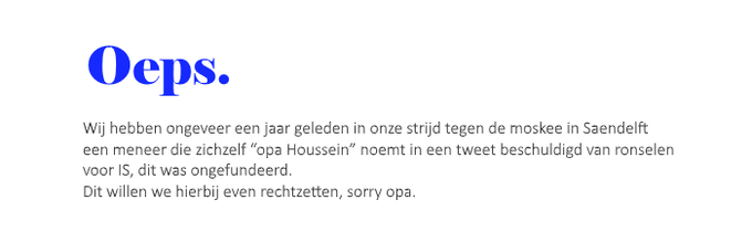 De fractievoorzitter van de partij zou al in het eerste gesprek op het politiebureau hebben erkend dat een van zijn partij-genoten de tekst had geplaatst en dat de kwalificatie ‘ronselaar’ ‘iets te heftig was’, maar de tweet bleef desondanks zichtbaar en er kwam ook geen excuus. De tweede keer dat Peter van Haasen werd ontboden kreeg hij te horen dat er toch zou worden opgetreden als hij de tweet niet verwijderde en rectificeerde en dat de toegang tot het plaatselijke PVV-account bovendien moest worden beperkt tot twee personen. Daarop volgde een tweet onder het ‘nogal badinerende’ kopje Oeps . ‘Zowel de melder als het BD is blij dat het Openbaar Ministerie erkent dat partijen niet straffeloos laster mogen verspreiden,’ zo besluit het bericht.