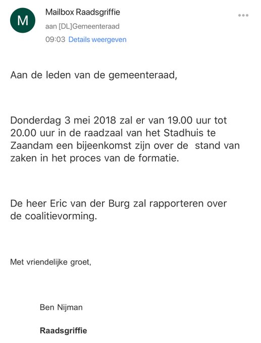 Zelfstandig ondernemer Van Haasen is ‘met unanieme steun de nieuwe fractievoorzitter van de PVV in Zaanstad geworden’. Er staat ook een kort citaat van de nieuwe leider in de brief: ‘Er is een hoop te doen in onze gemeente en ik ga mijn uiterste best doen om daar als fractievoorzitter een positieve bijdrage aan te leveren.’ Coalitievorming