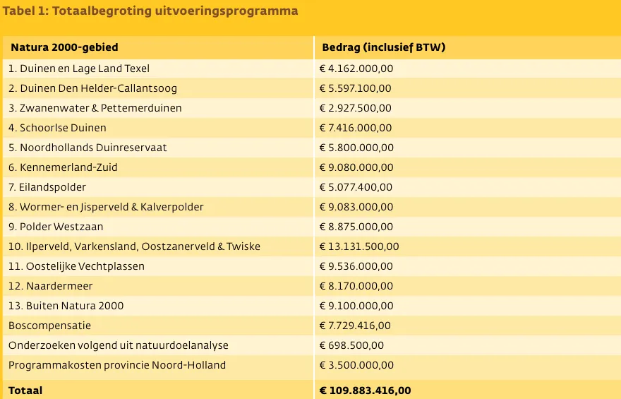 Het gaat om projecten in de duinen, de Vechtplassen, het Gooi en de veenweidegebieden van Laag-Holland. De meeste maatregelen zijn bedoeld om duingraslanden, veenmosrietlanden, vochtige laagveenheiden en trilvenen te beschermen. Een deel van het geld is voor boscompensatie en onderzoek. De maatregelen worden de komende zes jaar uitgevoerd in nauwe samenwerking met natuurbeheerders, waterschappen en gemeenten. Niet alles wat de provincie wilde aanpakken kan waarschijnlijk snel worden uitgevoerd: de aanvraag was voor bijna 110 miljoen. De provincie krijgt nu ruim 90 miljoen en kan in 2027 nog 20 miljoen euro aanvragen.