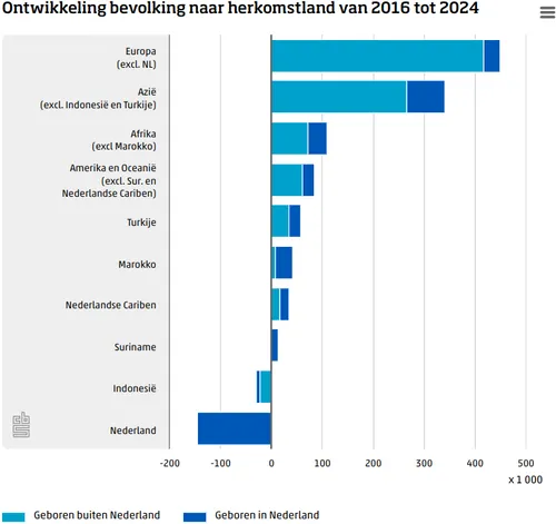 De afgelopen acht jaar groeide de Nederlandse bevolking gemiddeld met 120.000 inwoners per jaar, aldus het CBS. In de vijftien jaar dat het aantal Nederlanders van zestien naar zeventien miljoen ging, kwamen er jaarlijks gemiddeld 66.000 inwoners bij. Al sinds 2015 neemt het aantal Nederlanders voornamelijk toe door immigratie. En in 2022, 2023 en de eerste helft van dit jaar groeide de bevolking alleen doordat er meer immigranten dan emigranten waren, want in die periode werden er minder baby's geboren dan er mensen overleden.