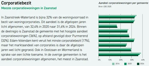 De afgelopen vier jaar nam het marktaandeel van corporaties in alle deelregio’s af, maar de afname was relatief het grootst in Zaanstreek - Waterland: van 32,8 naar 31,6 procent. Wel blijft onze regio na Amsterdam (34,5 procent) die met het grootste aandeel corporatiewoningen. In Zaanstreek-Waterland wordt één op de vijf corporatiewoningen bewoond door stellen zonder kinderen.