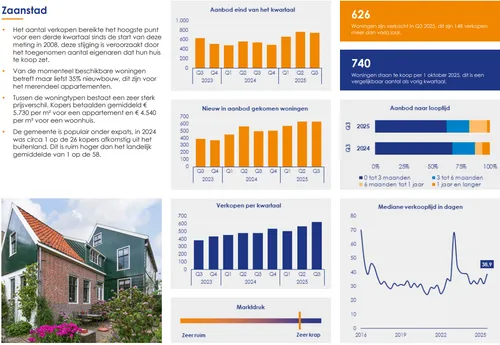 Sprekende Cijfers Woningmarkten Q3 - 2025 van KRK Makelaars en Dynamis. In vrijwel alle gemeenten stegen de verkoopprijzen, met Zaanstad als uitschieter.