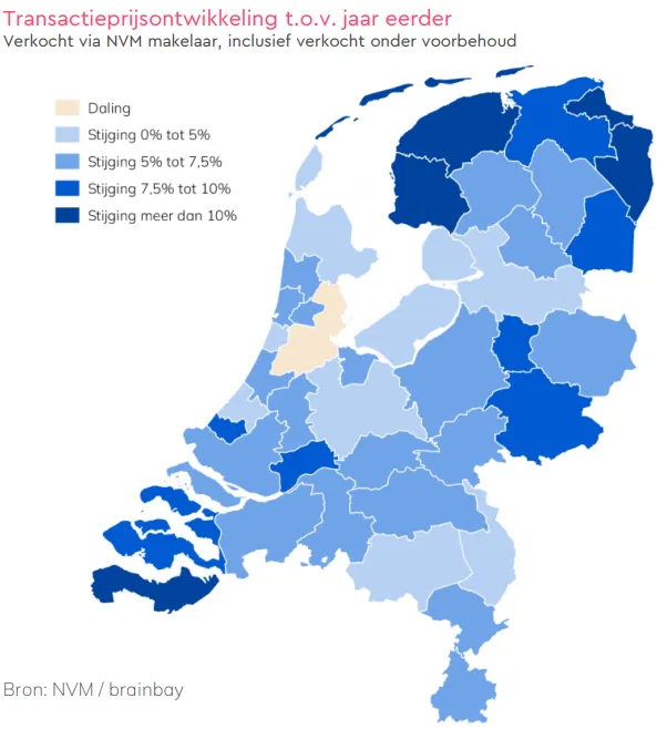 Meer belasting en strengere huurwetten hebben het minder aantrekkelijk voor hen gemaakt om een woning opnieuw te verhuren. Het zijn vaak wat kleinere appartementen van mindere kwaliteit en met een lager energielabel. Het grotere aanbod en de uitpondingen hebben geleid tot een kleinere prijsstijging, aldus de NVM. Kopers hebben de afgelopen drie maanden gemiddeld 496.000 euro neergelegd. Dat is 4,8 procent meer dan in dezelfde maanden vorig jaar. Vergeleken met het tweede kwartaal werden huizen juist bijna één procent goedkoper. In Zaanstad is nog steeds een stijging te zien, in Amsterdam juist een daling.
