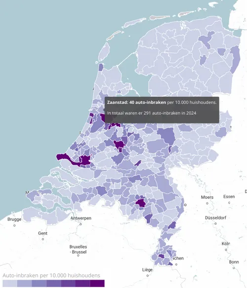 Zaanstad is niet de populairste gemeente in Noord-Holland bij autokrakers: vorig jaar waren er 40 inbraken in auto's per 10.000 inwoners en daarmee zit de gemeente niet in de provinciale top tien. Amsterdam gaat aan kop 156 auto-inbraken per 10.000 huishoudens, gevolgd door Ouder-Amstel (150) en Bloemendaal met 146.