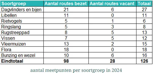 In 2022 waren er 67 aanmeldingen van vrijwilligers, waarvan 42 voor een soortgroep aangemeld zijn. Een jaar later waren het er 98, waarvan 73 actief waren bij een soortgroep. Vorig jaar waren die cijfers 130 en 104. Een vrijwilliger kan overigens meerdere keren als waarnemer zijn meegeteld als diegene zich voor meerdere soortgroepen heeft aangemeld. Alle resultaten vindt u