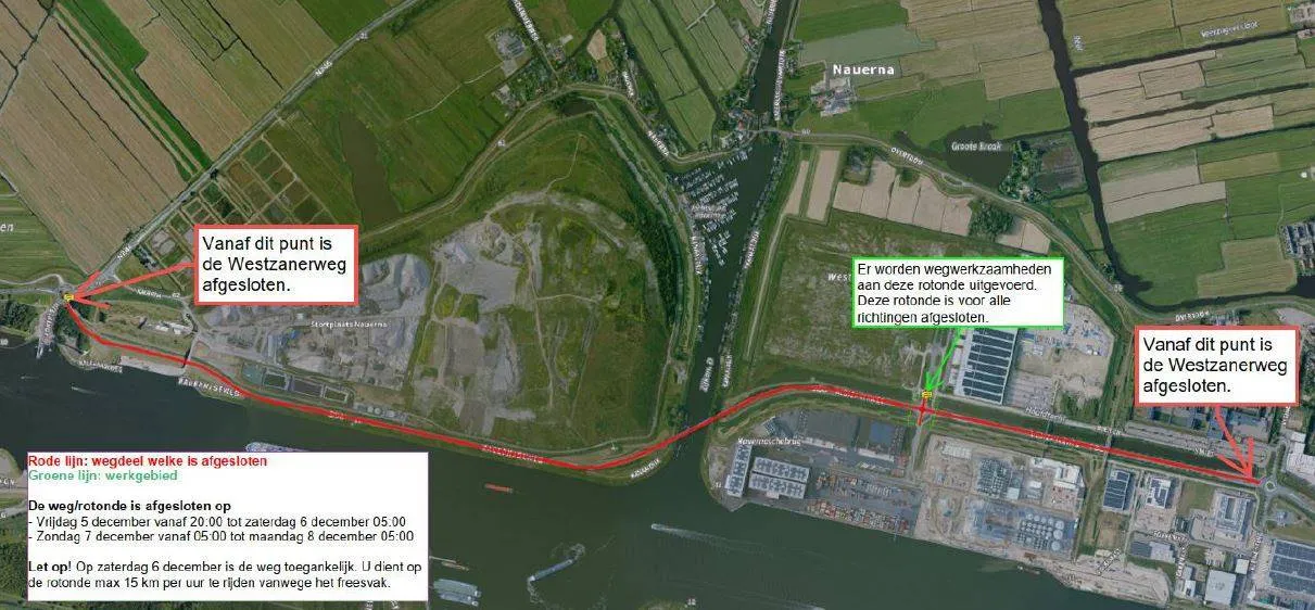 Er worden binnenkort wegwerkzaamheden uitgevoerd op de Westzanerweg ter hoogte van de rotonde bij HoogTij. Hierdoor zal de weg van vrijdag 20:00 tot zaterdag 6 december 05:00 uur en van zondag 7 december 05:00 tot maandag 8 december 05:00 uur afgesloten zijn voor al het verkeer: