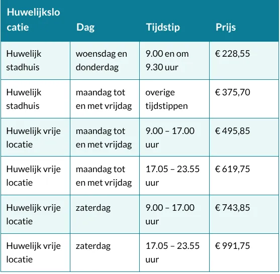 Een huwelijk op een gemeentehuis op een vrijdagmiddag kost in 2026 in ons land gemiddeld 506 euro. Op zaterdag is een ceremonie duurder en kost gemiddeld bijna 794 euro, zo blijkt uit een inventarisatie van het ANP. Zaanstad is op de vrijdag goedkoper. Gratis kan ook, maar dat betekent lang wachten.