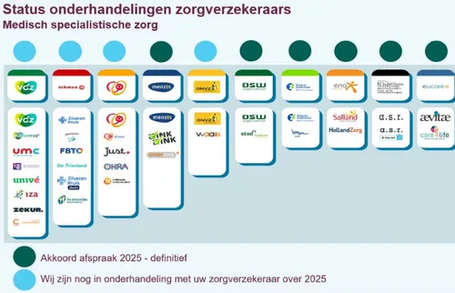 Hieronder staat een overzicht met de stand van zaken per zorgverzekeraar op 30 januari. 'Als we nog in onderhandeling zijn met een verzekeraar en u heeft zorg nodig, kijk dan in de zorgzoeker van uw verzekeraar wat dit voor u betekent. Komt u er niet uit, neem dan contact op met de verzekeraar. Behandelingen uit de basiszorgverzekering worden in principe helemaal vergoed, behalve het eigen risico,' aldus het ZMC in een update van de stand van zaken.