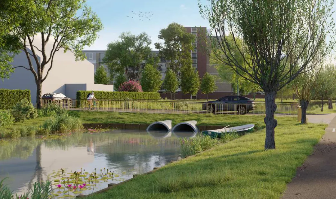 Bij deze variant is uitgegaan van de bestaande hoogtes (bovenste impressie) en het ophogen van de Marslaan ter hoogte van de aansluiting (die daaronder). Variant 3 gaat uit van het verplaatsen van de vaarroute van de Kerksloot door het woningbouwplan. Dit betekent dat de Kerksloot geen doorvaarbare route meer wordt en er geen rekening hoeft te worden gehouden met een doorvaarthoogte. Het resultaat is een rechte dam met een duiker in het verlengde van de Slibkuil richting Militaireweg.