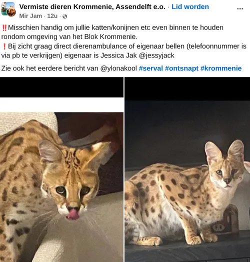Opnieuw is een serval ontsnapt in Zaanstad, ditmaal in Krommenie. Had de vierjarige Nyo twee weken eerder de benen genomen dan had hij in theorie zijn soortgenoot Tora kunnen tegenkomen, maar die harige Houdini
