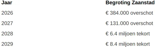 De begrotingsvoorstellen zijn sluitend voor 2026 en 2027 maar een miljoenentekort dreigt voor de jaren daarna, aldus de aankondiging van de publicatie van het stuk. Door een groeiend takenpakket dat daarnaast steeds hogere (wettelijke) eisen kent, door geldgebrek en door capaciteitsvraagtukken staat de Zaanse begroting onder druk. 'Het Rijk moet de gemeenten voldoende geld geven om alle taken te kunnen uitvoeren. Het afgelopen jaar heeft Zaanstad samen met de Vereniging van Nederlandse Gemeenten in Den Haag geprobeerd om de dreigende korting van 2,3 miljard euro voor gemeenten ongedaan te maken. Na de publicatie van