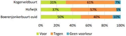 In de Kogerveldbuurt (34 procent), Hofwijk (25) en Boerejonkerbuurt Zuid (21 procent) hebben relatief weinig bewoners de moeite genomen om de enquête in te vullen. Uit de enquête wordt wel duidelijk dat er geen draagvlak is voor betaald parkeren in de Kogerveldbuurt en de Hofwijk. Dat zal er daarom voorlopig ook nog niet komen. In de Boerejonkerbuurt-Zuid is de helft van de bewoners of andere belanghebbenden die de enquête heeft ingevuld vóór en daardoor is invoering mogelijk.