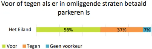 Uit de resultaten blijkt dat een meerderheid van de bewoners (56 procent) vóór de invoering van betaald parkeren in de buurt is. In combinatie met de hoge parkeerdruk in de wijk maakt dit de invoering van betaald parkeren op Het Eiland wenselijk.