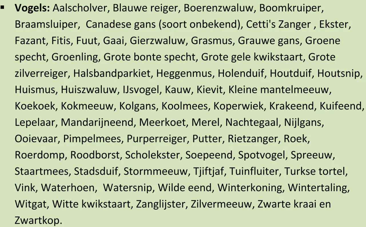 Volgens de Nationale Databank Flora en Fauna zijn er 84 soorten vogels, tien soorten zoogdieren, vijf soorten vleermuizen en één amfibie in het gebied gespot. Dat is een lange lijst: