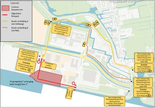 Het Havenbedrijf begint komende maand met werkzaamheden voor de aanleg van een nieuwe kade op HoogTij in Westzaan, wat betekent dat het fietspad langs het Noordzeekanaal deels moet worden afgesloten. Om de kade te verlengen zal vanaf 3 maart tot maart volgend jaar het fietspad ter hoogte van het bouwperceel dicht zijn voor fietsers. Voor voetgangers wordt een trap aangebracht die aansluit op de Fokkemast ter hoogte van de Machinekamer om de hinder zo beperkt mogelijk te houden.