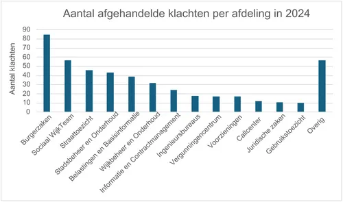 De meeste klachten hebben betrekking op afdelingen die meer diensten leveren aan en contact hebben met inwoners, zoals Burgerzaken, Straattoezicht en Belastingen. De verhouding aantal klachten tot het aantal contactmomenten ligt onder de 0,5 procent,' meldt het