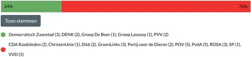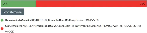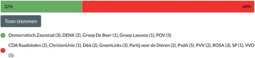 Met deze uitslag is ook de voorzet van Lokaal Zaans voor een referendum over parkeren van tafel, omdat er immers geen voorstel meer ligt om voor of tegen te zijn. De visie leverde een recordaantal amendementen - voorstellen tot wijzigingen - op, die we hierna op een rij zetten inclusief de stemverhoudingen. De moties volgen later. We beginnen met de uitslag van de stemming over de visie als geheel.