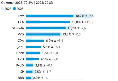 Bij de vorige verkiezingen in 2023 was de PVV in Zaanstad ook al de grootste partij, maar toen met een kloof naar de runner-up GroenLinks-PvdA: 26 tegen achttien procent. Op drie eindigde toen de VVD met veertien procent. D66 moest het doen met 5,5 procent van de stemmen. Nieuwkomer NSC was twee jaar geleden nog de hoop in bange dagen voor elf procent van de stemmers, maar die is nu helemaal vervlogen met een schamele 0,4 procent. De uitslag voor Zaanstad is nog niet definitief: die volgt over enkele dagen na een controle door het hoofdstembureau. De definitieve landelijke uitslag wordt op 7 november door de Kiesraad bekend gemaakt. Hieronder de cijfers van Zaanstad: